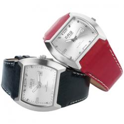 Material:Stainess steel case with brushed silver finishing and integrated black and red leather strap