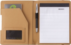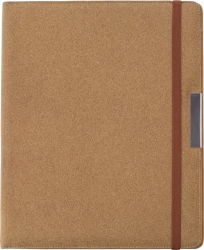 A5 cork portfolio, with a rubber band closing, PU inside with a small mesh pocket for business cards, a larger pocket, a twenty page note pad, and an elasticated pen loop (pen not included).