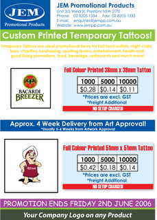 Temporary tattoos are awesome fun. Here at JEM Promotional Products, we love testing our pre-production samples on our own skin – the only true way to test the quality of a custom temporary tattoo! We have some temporary tattoos on promo, for a short amount of time with a smaller than usual minimum order quantity, with the cost savings of producing the product overseas.