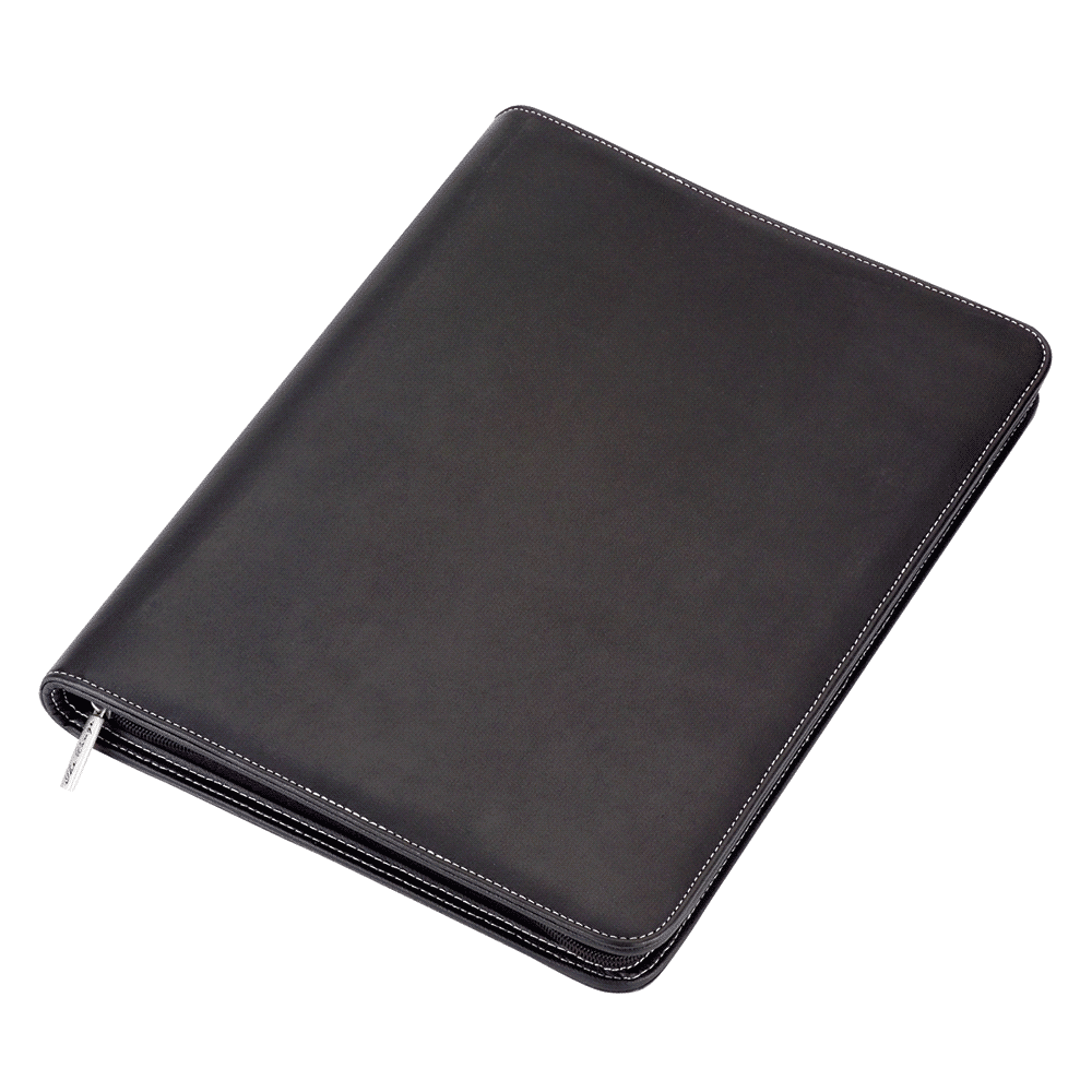 Features include zipper closure, internal gusseted pocket, internal zippered pocket, 2 pen loops, business card holders and comes with a spiral lined note pad. Pens not included.