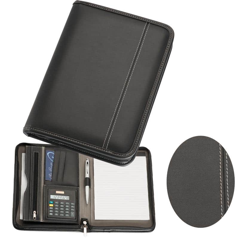 | Includes 25 page lined pad which insert from the top, solar calculator, internal pocket and zippered internal pocket, business card holders and pen loop. Pen not included. | |