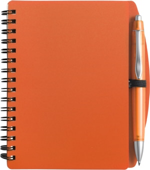 A6 Spiral bound PVC covered sixty five page notebook and plastic ballpen with blue ink.
