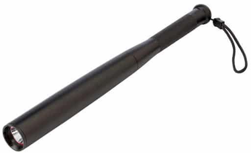 Aluminium torch in shape of a baseball bat with a 3Watt Cree LED light (approx. 80-100 Lumen), and a rubber on/off button. Alkaline batteries included.