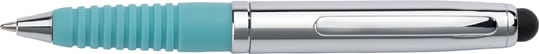 Small steel ballpen with coloured silicone barrel, includes rubber tip suitable for all capacitive screens, blue ink.