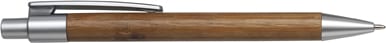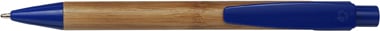 Bamboo ballpen with plastic coloured parts and blue ink.