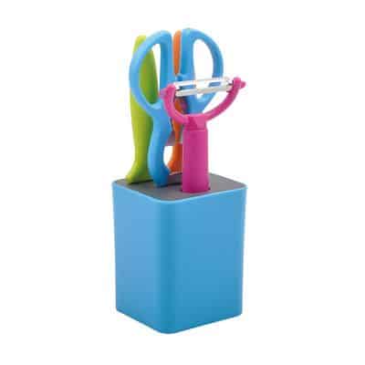 Plastic holder including scissors, peeler, 2 knives. Useful kitchen set for all uses.