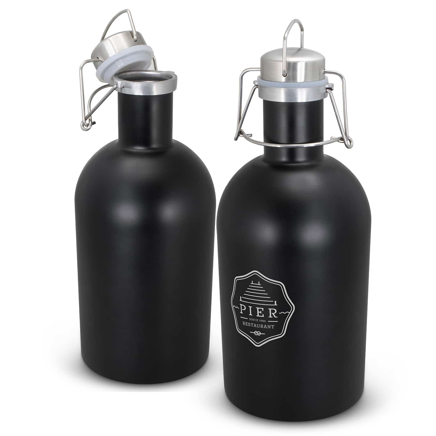 Solid 2L Stainless Steel Beer Growler with a secure spring wire lid which is presented in a black gift box. Laser engraving on this product comes as a stainless steel finish This product is not dishwasher safe, and handwashing is recommended.