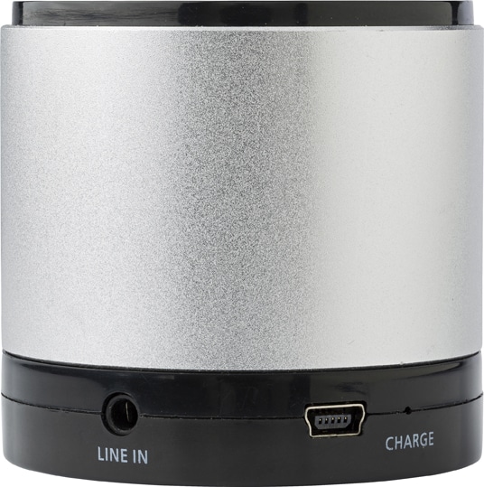 Aluminium Bluetooth speaker, with a power output of 3.0 W SNR>85+2dB, speaker (20HZ-20KHZ) with a Li-ion battery input vof 400 mAh, including a line-in cable and a USB cable, has buttons to determine functions, a microphone input, and an on/off switch.