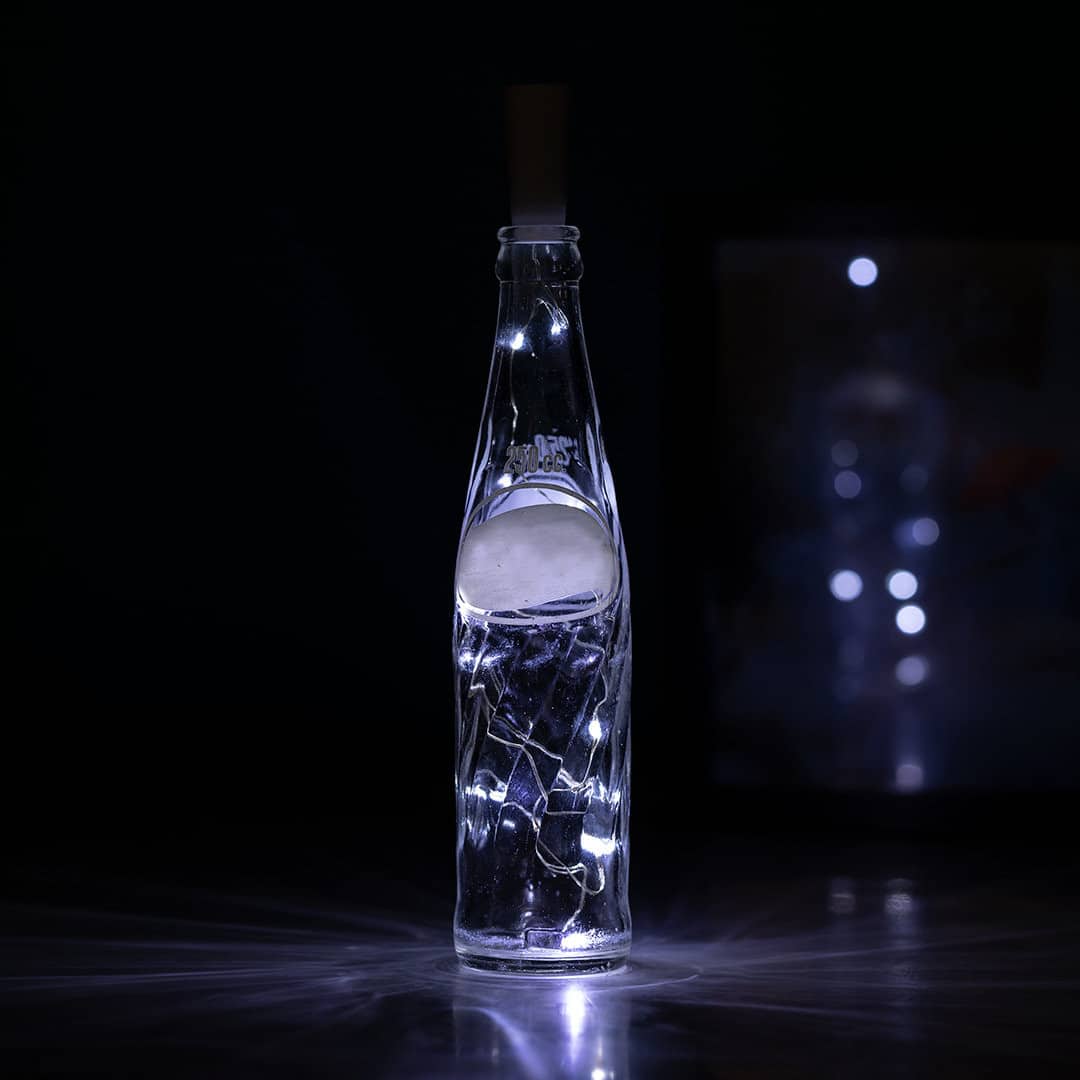 Unique light stopper for bottle decoration. Including cable with 10 LED lights in white color and battery powered (button cell included). ON/OFF button and presented in an attractive design box.