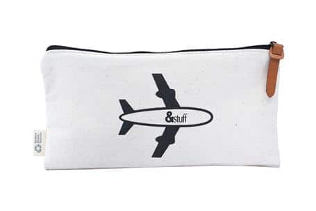 &Stuff is a range of user-friendly products designed with the environment in mind. All of the items in this on-trend range are hand made from 100% natural unbleached calico cotton and are durable, washable and reusable. Calico Travel Pouch is ideal for keeping all your travel documents and accessories safe and secure. Ideal for storing your passport, boarding pass, travel cash, itinerary, battery charger and charging cables. Your logo can be printed or debossed on one side of the pouch with our &Stuff icon printed on the reverse side. Options – select either: (1) natural or black coloured zip, (2) natural cotton zip puller or leatherette zip puller, (3) debossed logo onto the leatherette badge or screen printed directly onto the calico material.