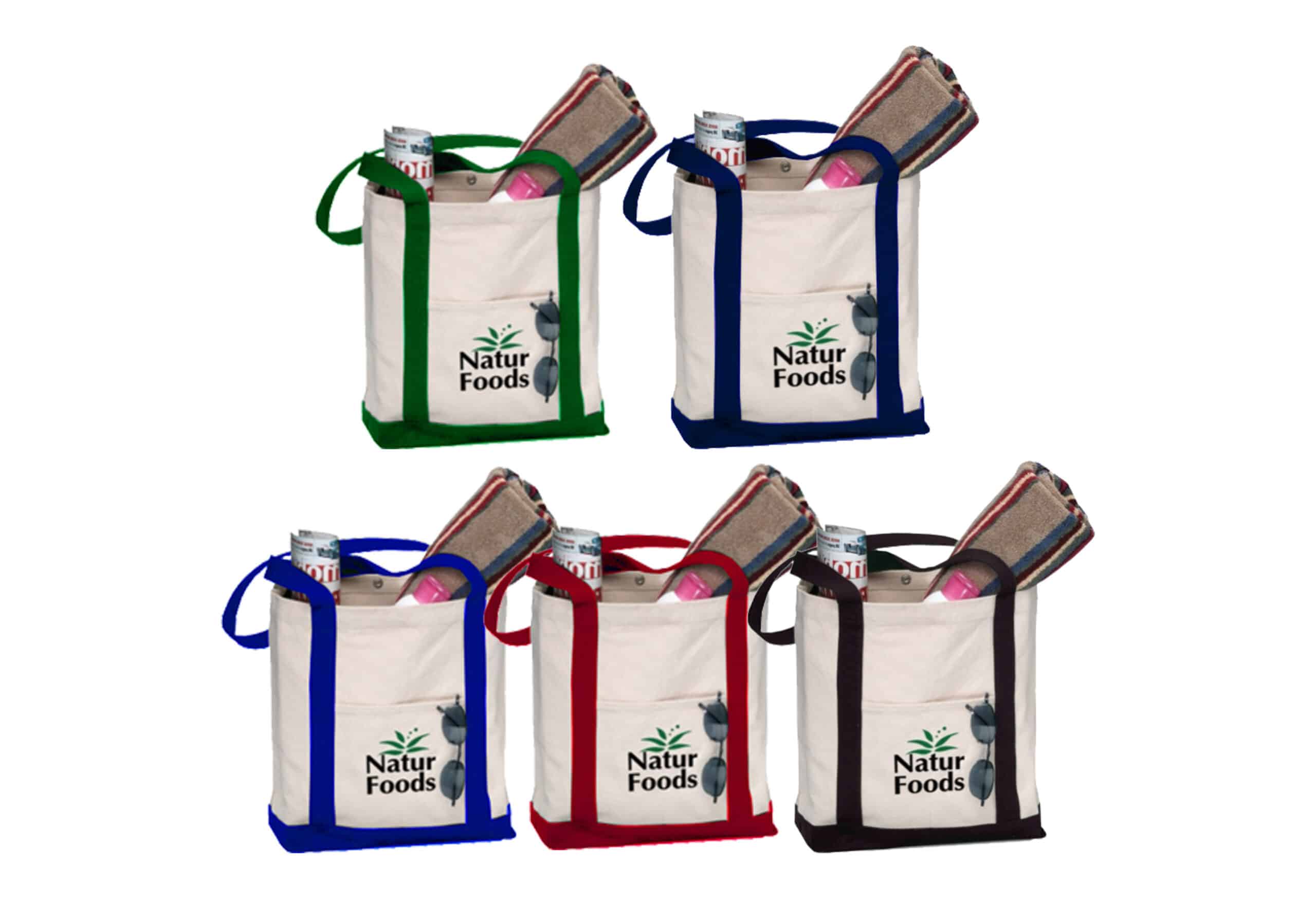 Canvas beach bag made from 280gsm canvas fabric. The handles and base can come in a wide range of colours and the bag features storage pockets on the inside and outside of the bag.