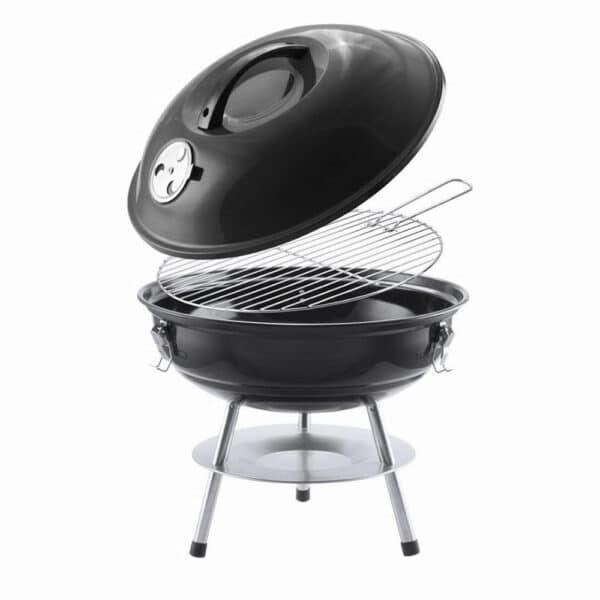 Barbecue made of resistant carbon steel with black finish. Lid with comfortable handle and ventilation holes, with metal grill, anti-drip plate and non-slip feet. Presented in an attractive design box.