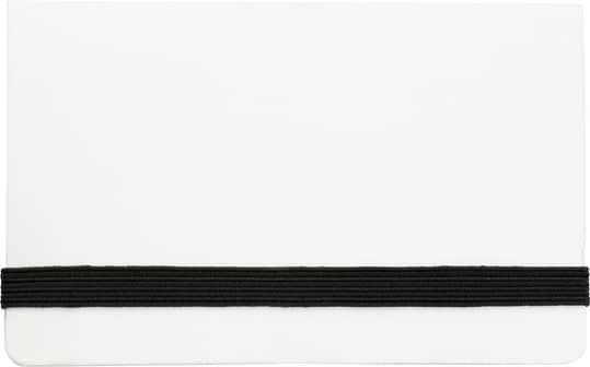 Card booklet with one hundred fifty sticky notes and inside pocket for business cards. Can be closed with a fabric ribbon.