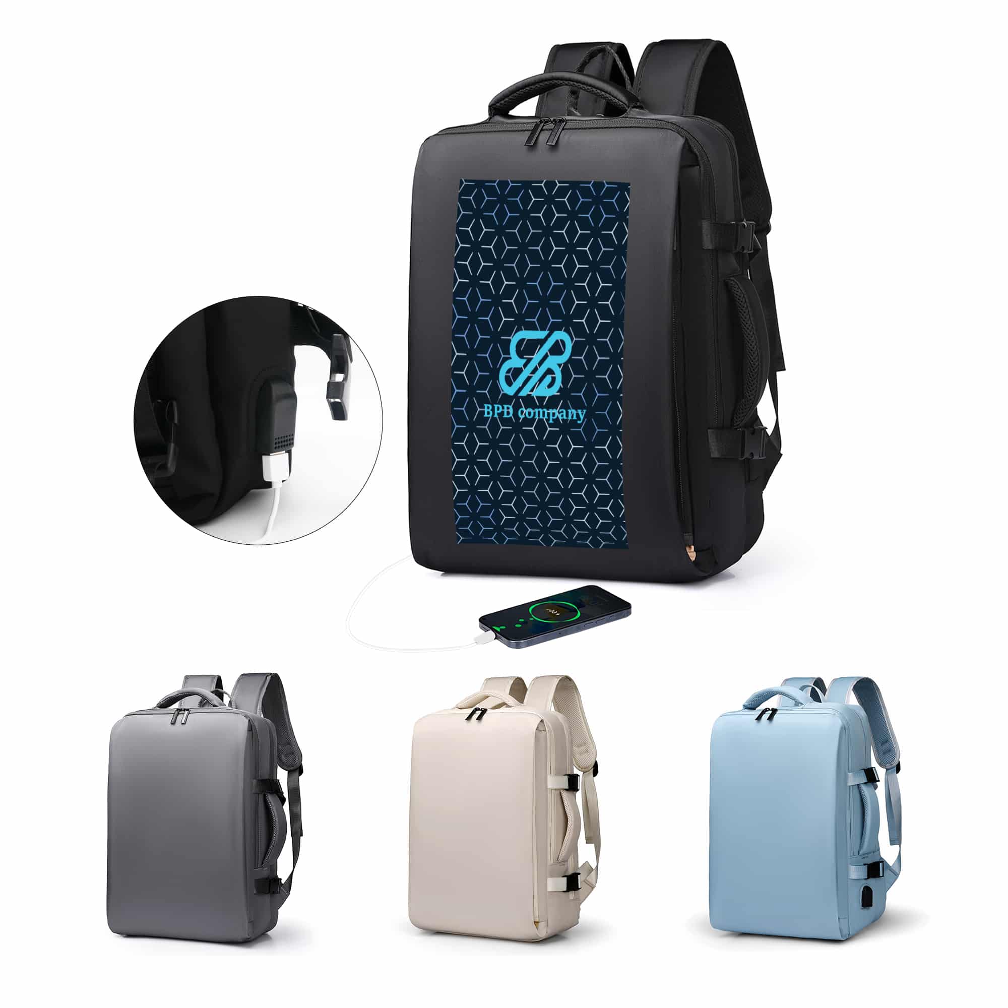 This Carry-on Travel Backpack is the perfect business companion which fits up to your 15″ laptop, featuring 2 big front zipper pockets, 2 handles for easy carrying, a belt on the back for suitcase fastening and a main pocket with USB charging. Our quality backpack is made of Oxford material, that is water resistant and durable. With full colour heat transfer to showcase your design, you can choose from 4 colours.