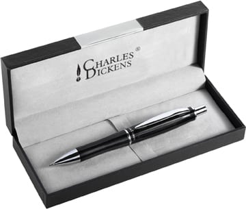 Charles Dickens® metal ballpen with silver trim, push button mechanism and black ink, supplied in a deluxe presentation case.