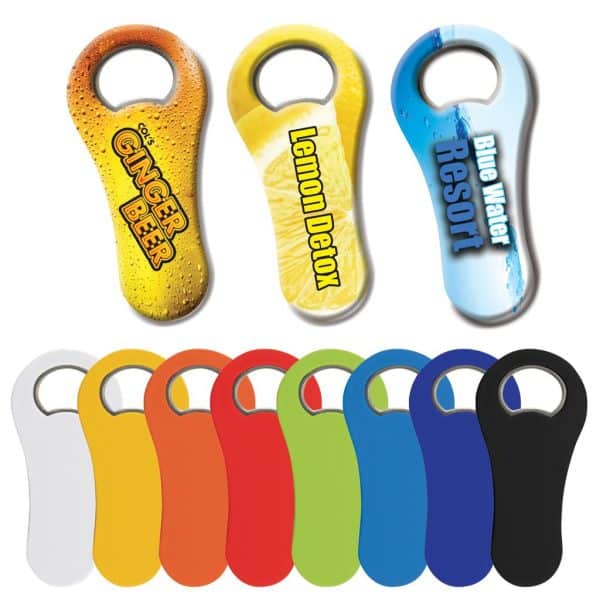 Sturdy ABS plastic bottle opener with nickel plated steel opener and magnet on back for attaching to fridge.