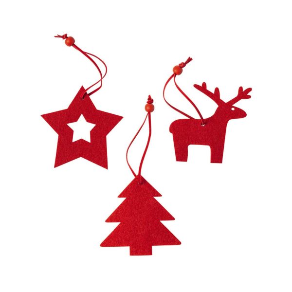 Set of 3 Christmas figures to hang in soft felt in red Christmas color. Includes reindeer, star and Christmas tree. Presented in an individual pouch with white printing surface.