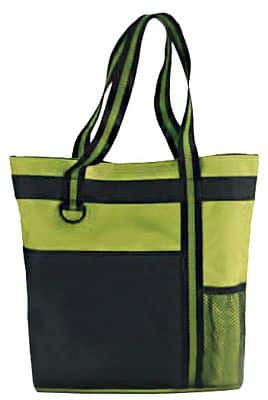 Durable polyester fabric with colour blocking. Large front pocket and mesh bottle pocket. 2 tone durable polyester webbing handles.