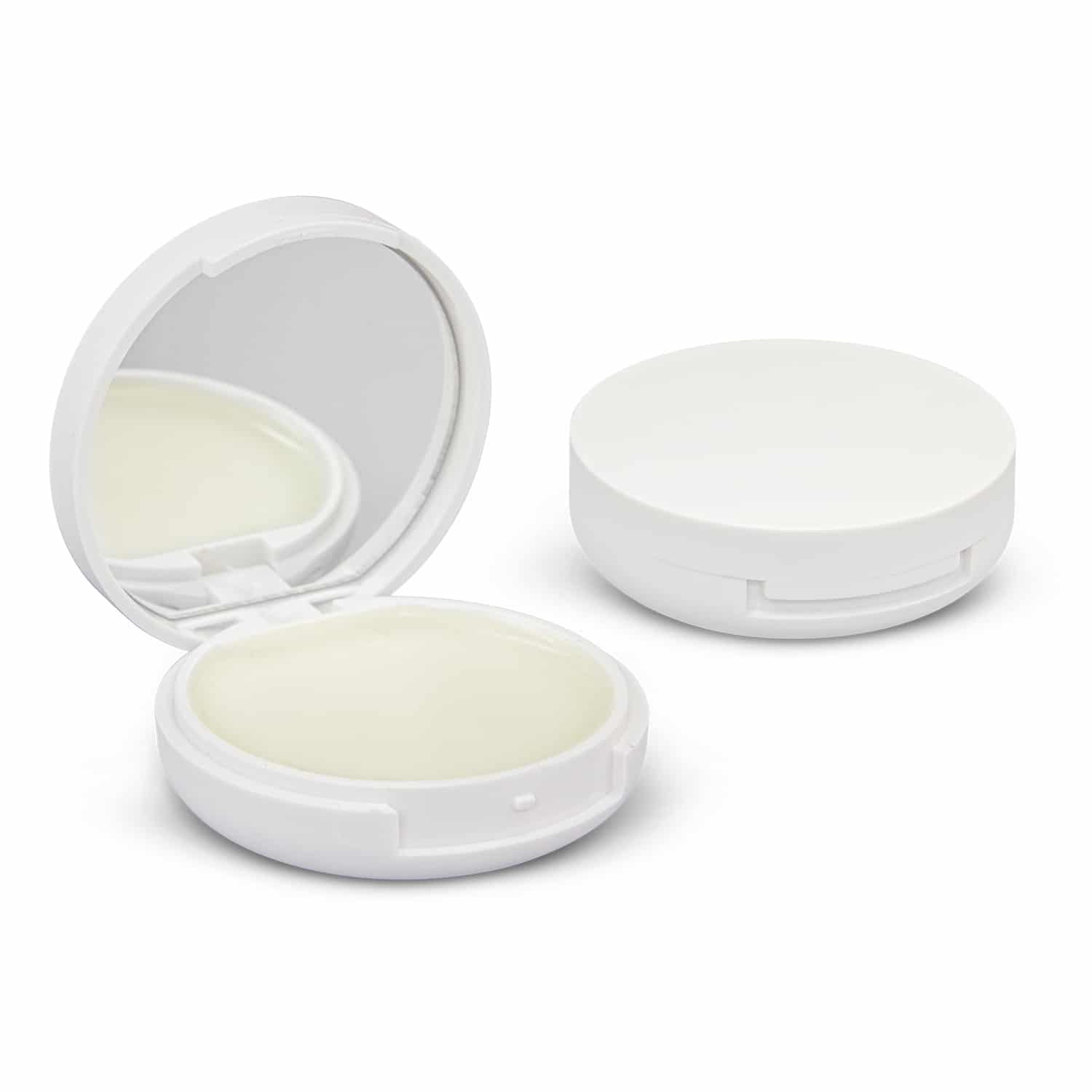Handy compact mirror with a hinged lid and 7g of lip balm. It has an ingredients label on the base.