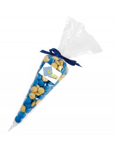 Clear cone shaped bag filled with corporate colour Chocolate Gems and decorated with a custom colour ribbon
