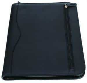 Microfibre and leather look PVC. Zippered compartment. Multiple storage pockets with mesh card holder. A4 writing pad.