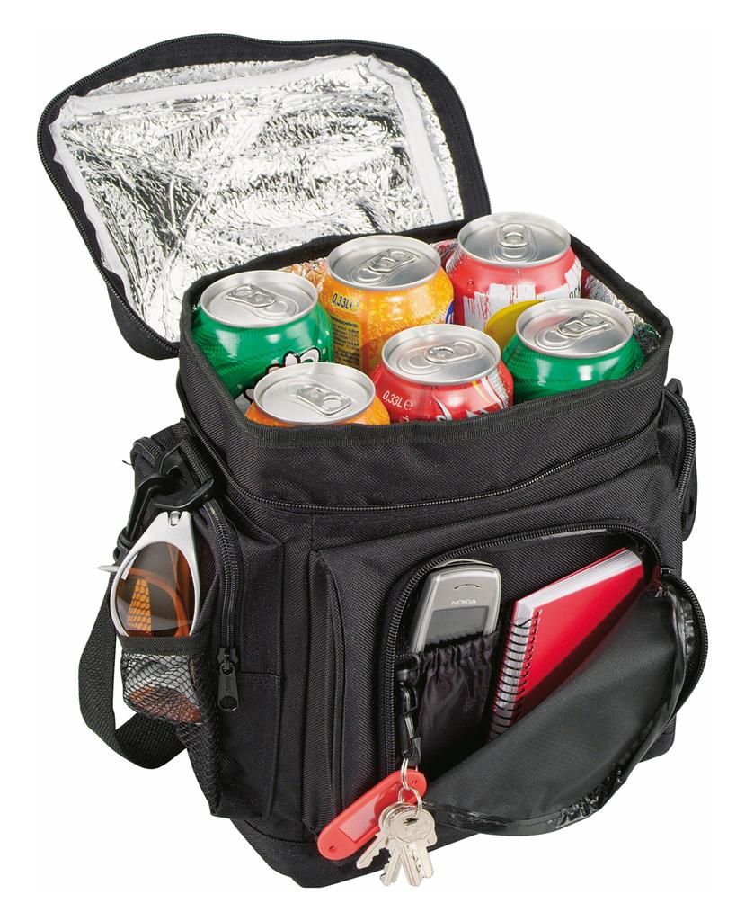 Black 600D polyester cooler bag with silver insulated inner, outer mesh pockets and multiple zipped
