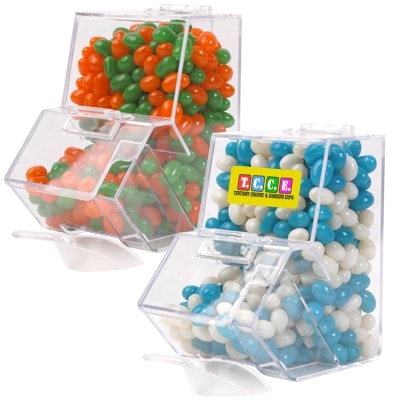 630 grams of corporate colour jelly beans packed in dispenser with scoop. Choose up to 3 colours – Green, Red, Orange, White, Yellow, Black, Pink & Blue. Finished weight = 840 grams. Item Size: 92L x 138H x 110W