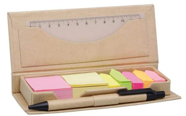 Ecologically sound recycled cardboard stationery set with 12cm ruler, black ink cardboard pen and selection of flags and sticky notes.