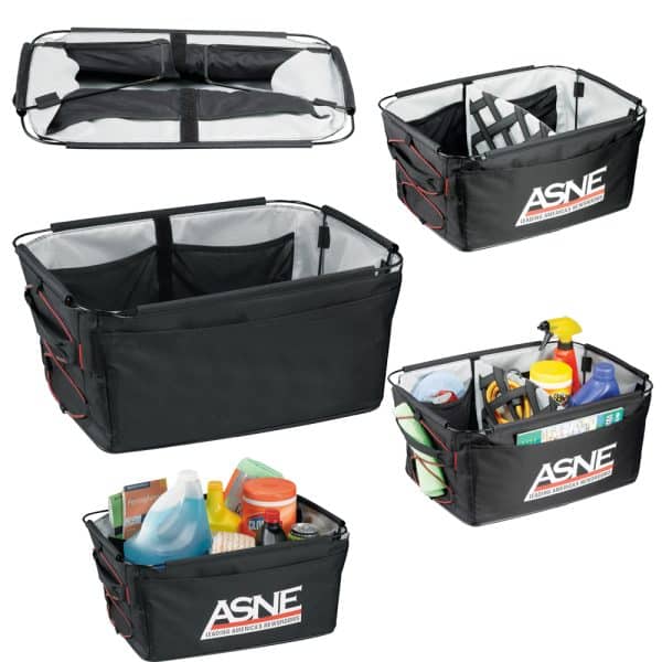 With four elastic interior pockets included on the inner wall and two exteriors pockets included on the outer wall. Velcro strips on the bottom secure to car floors and carpets. Collapsible metal support system can fold flat for storage. Handles on each side allows for easy portability.