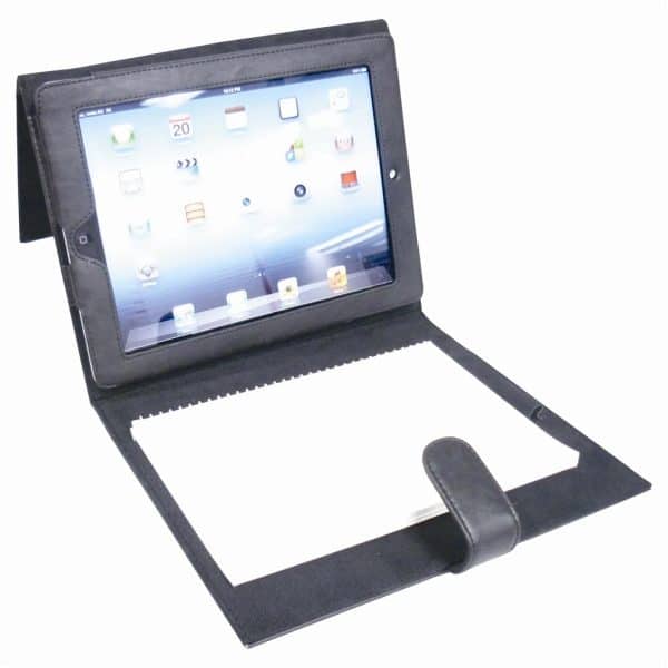 This iPad compendium is manufactured in padded PU leather with multiple pockets for business cards, brochures, stylus pen and a traditional A5 writing pad (included). With a press stud closure for security and multiple viewing angles for your iPad this compendium is an ideal executive gift.
