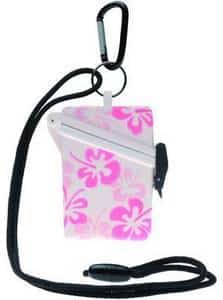 Hibiscus flower pattern. Nylon neck lanyard with breakaway clip and carabiner. Patented angle design. Crush resistant shell. 3 colour choices. Secure waterproof container for cash, credit cards, keys, indentification, etc.