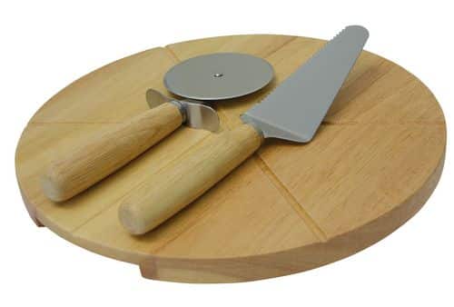 Solid wooden base and 2 tools; pizza cutter and turner. Boxed.