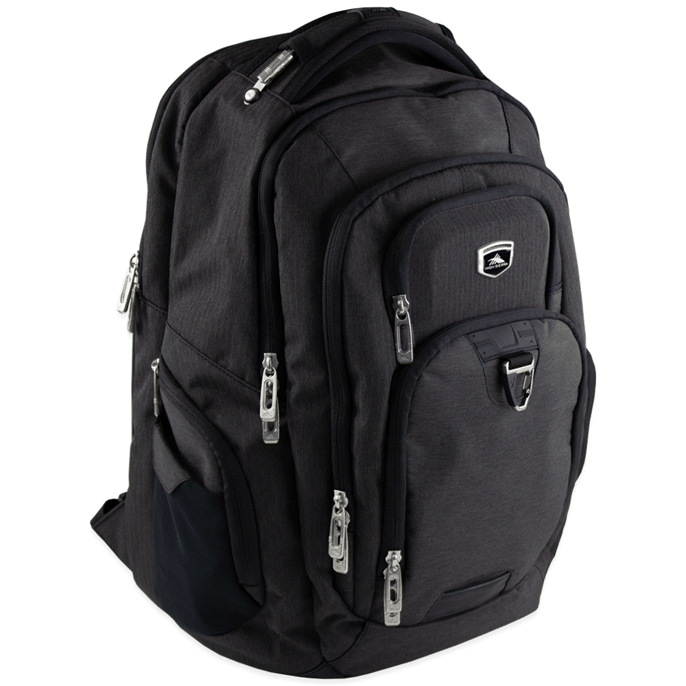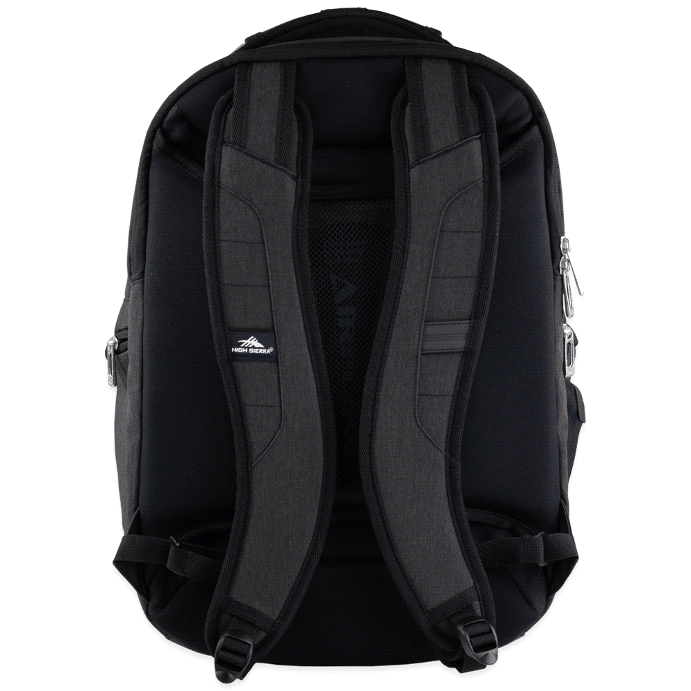 Features Side zippered pockets. Mesh water bottle pocket. Airflow™ mesh padded back panel with trolley pass-through. Padded and adjustable should straps, cable grab handle. High Sierra branding. The main compartment capacity is approximately 42 litres