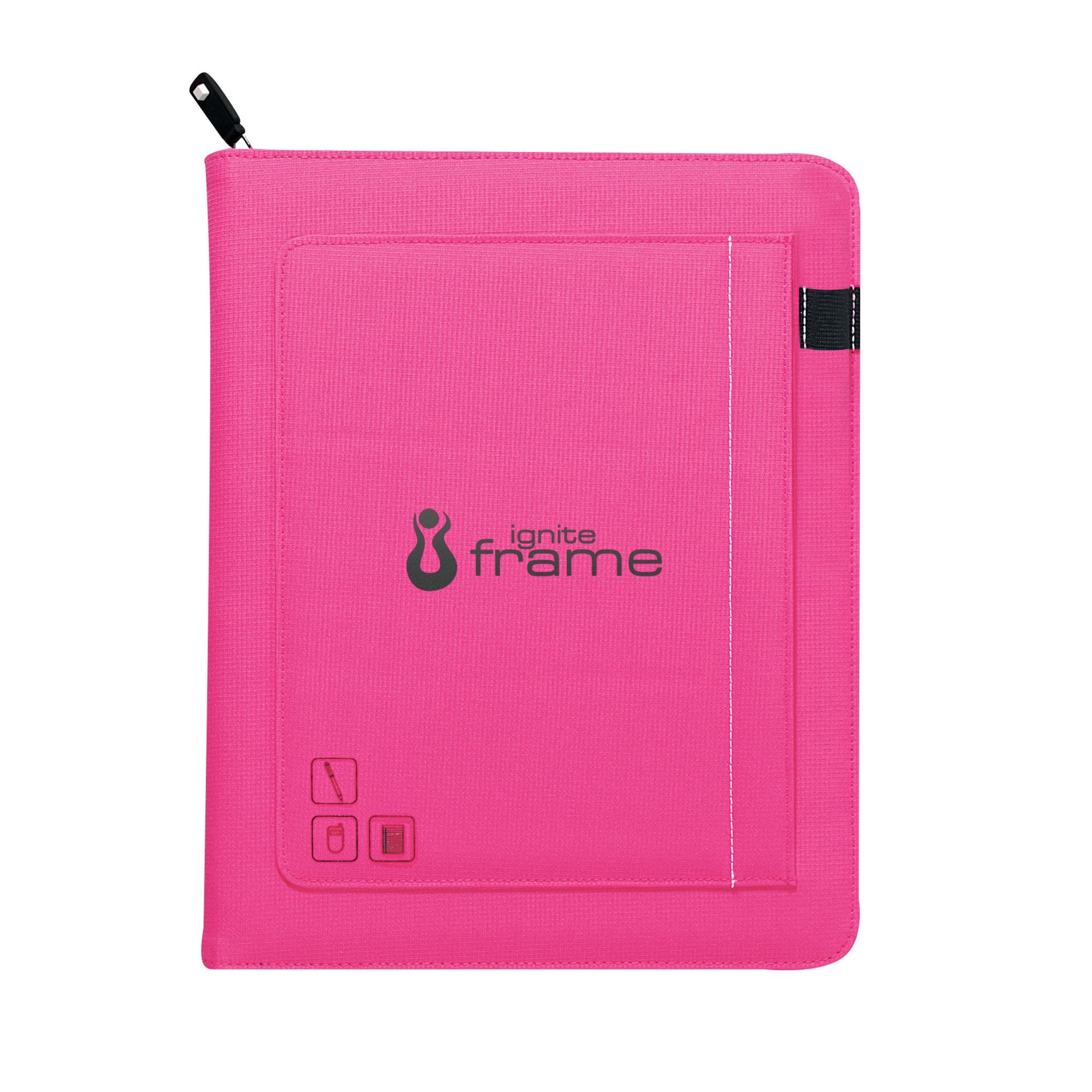 Exterior slip pocket, pen loop and pre-printed icons