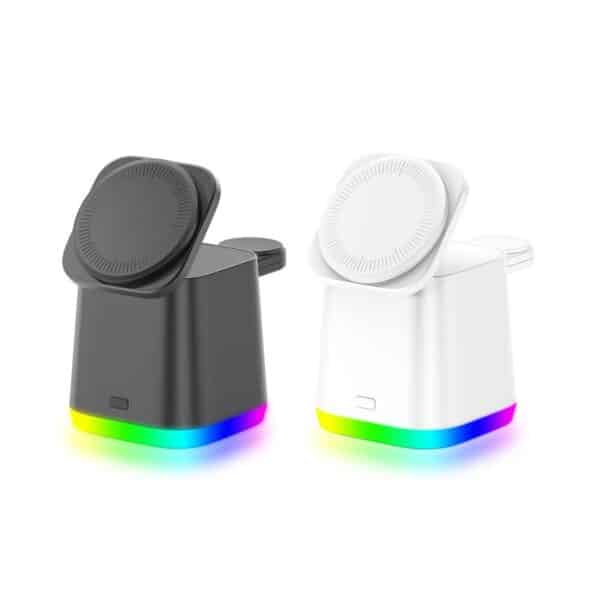 The Lamar 15W magnetic wireless charging stand is foldable and compact, making it an ideal desktop or bedside device. It simultaneously allows for quick and efficient charging of your Qi-compatible phone, TWS earbuds with wireless charging cases, and an iWatch or Samsung Galaxy Watch. This stand features magnetic phone charging in portrait and landscape orientation, a switchable tricolour nightlight and a detachable watch charger that can be removed and used independently via any USB-A port on the road. Safety is a top priority with this device, which includes ventilation holes that help reduce heat build-up, foreign object detection, overcurrent protection, and short-circuit prevention. The package includes a Type-C charging cable, an 18W (QC3.0) wall adaptor, and a user manual. Materials: ABS, Acrylic.