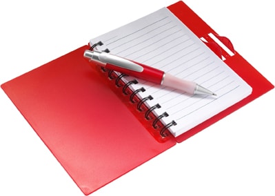 Lined notepad in a spiral bound plastic case (approximately one hundred sheets) supplied with a retractable ballpen with blue ink.