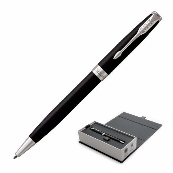 Stunning in matte black finish with striking chrome trim, the Parker Sonnet Ballpoint Pen offers an elegant twist action, retractable ballpoint. Parker pens can be printed or engraved (gold finish) on cap or upper barrel providing great options for your client’s promotional logo.