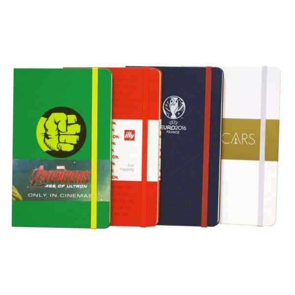 Carboard bound cover with rounded corners, bookmark and elastic closure