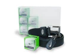 35mm Sleek stitchless tubular belt. Athletic roller buckle. Entire strap stretches for maximum flexibility. Includes 6 Nike Power Soft Golf Balls . Beautifully presented in a Clear Polypropylene Gift Box. – Box Decorated with Vinyl Decal. Min 5.