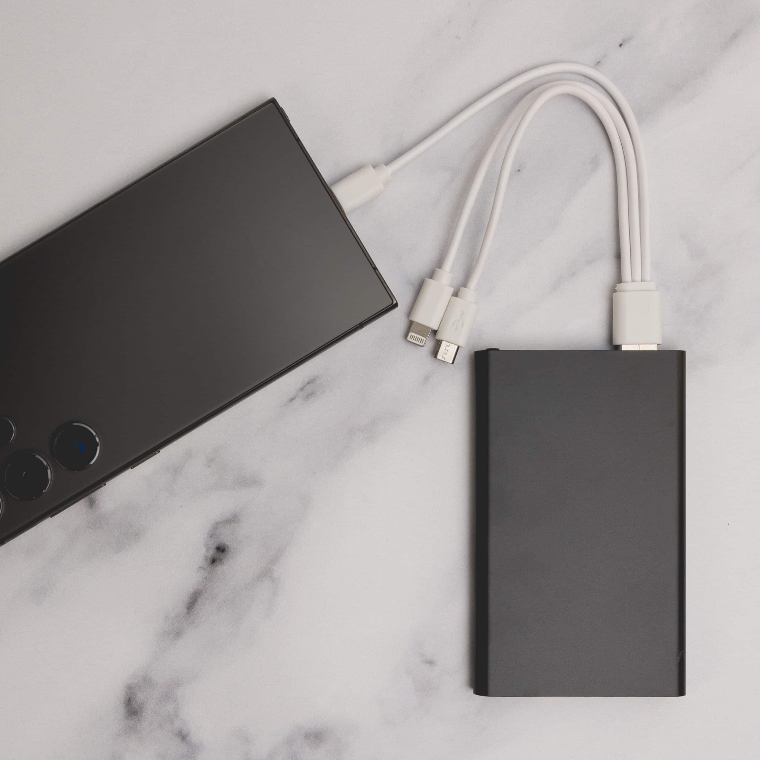 Stay powered up with the sleek Octavius Power Bank. Featuring a durable aluminium shell and 4000mAh Li-Po battery, it’s equipped with a USB-A inlet and Type C outlet, delivering 5V/2A output to keep devices charged on the go. LED indicators display battery capacity, and an on/off button provides control. Includes a 50cm 3-in-1 charging cable (Micro USB, 8-pin, Type C) for ultimate versatility. Available in Black or Silver, presented in a kraft tuck box.