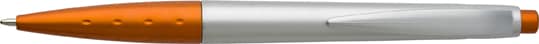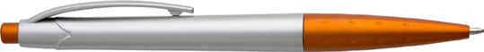 Plastic, push button ballpen with silver coloured barrel and clip and metallic coloured trim parts, black ink.