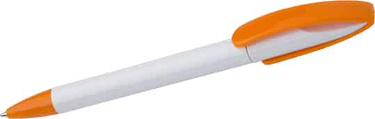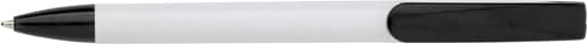 Plastic twist action ballpen with white barrel and coloured clip, blue ink.