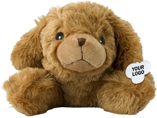 Dog, long plush material; its arms and legs are filled with small beans, includes tag for printing purposes.