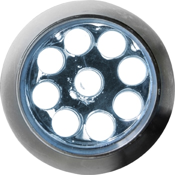 Brushed steel push button pocket torch with nine LED lights and nylon wrist band.