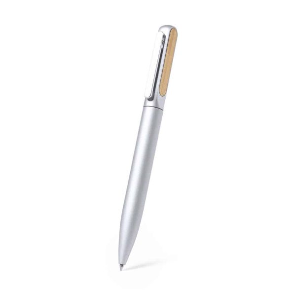 Matte finish aluminum ball pen with bamboo area for branding, twist mechanism and blue ink.