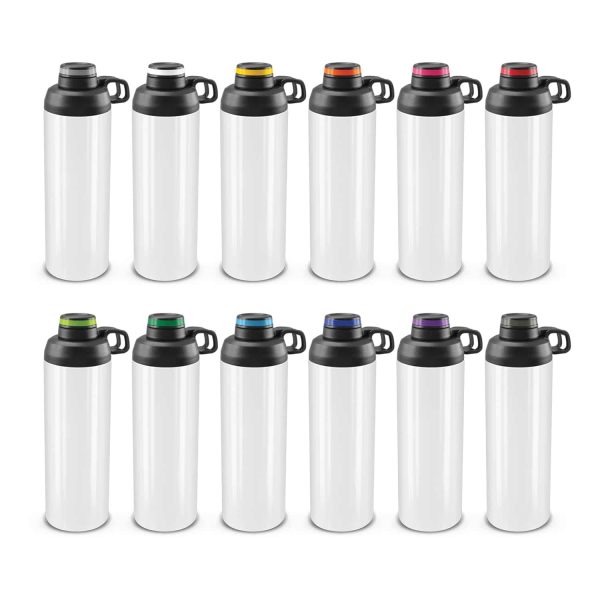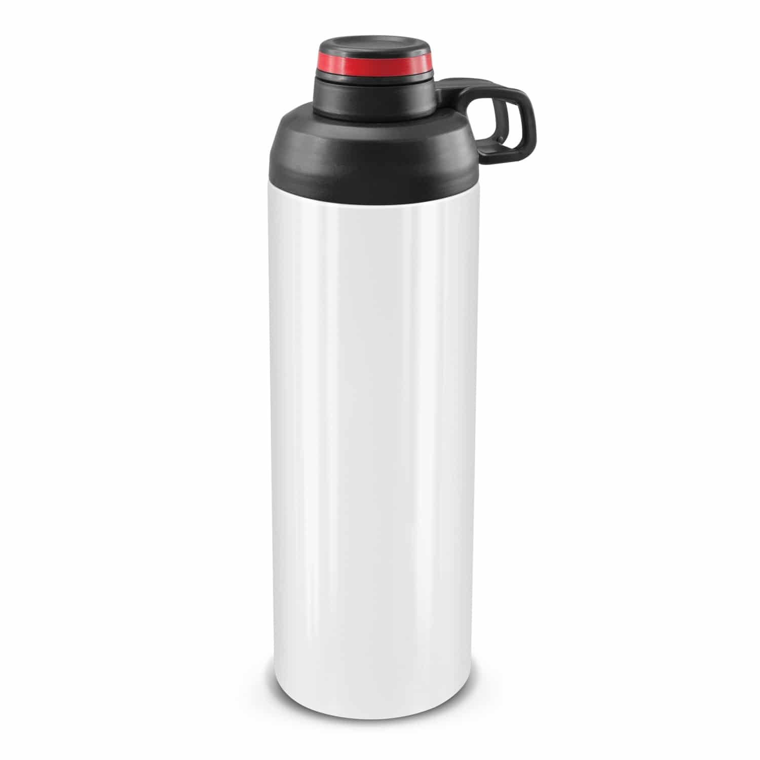 Large 900ml stainless steel drink bottle which has a secure screw on lid with a flip cap that has the option of adding a smart resin coated logo on the top. The lid also has a carry handle and a silicone outer ring for improved grip. Primo is BPA-free and has a wide opening which is ideal for adding ice cubes or fruit for flavouring. The black and white bottles laser engrave to a shiny steel finish and the silver bottle engraves to a natural etch. This product is not dishwasher safe and handwashing is recommended.