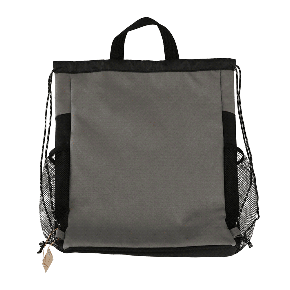 This drawstring features two side mesh pockets, perfect for water bottles or other small accessories. The roomy main compartment features a cinch closure.