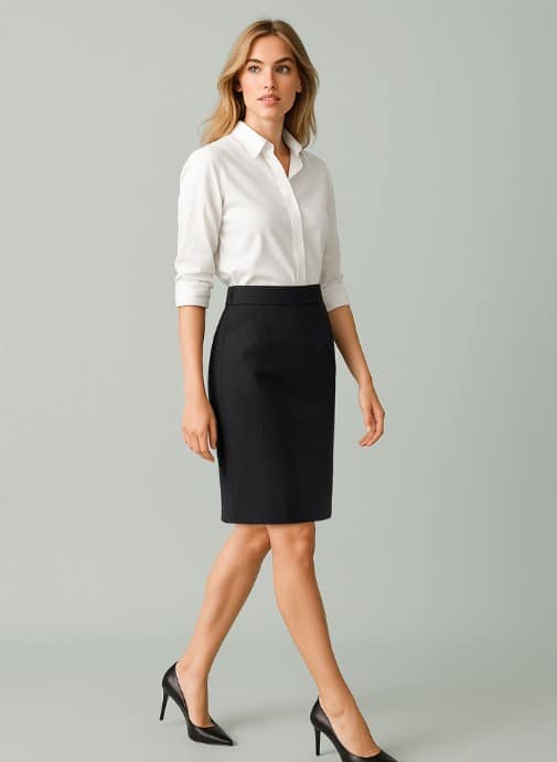 Introducing our new modern ‘travel’ suiting range engineered from an easy-care, machine wash-and-wear fabric with minimal creasing. Renew is designed for ease and versatility. This classic skirt is designed with comfort and ease in mind, ideal for most work environments. Featuring side elastic for stretch, comfort, and extra functionality, this skirt is made from easy-care, machine wash-and-wear fabric with minimal creasing, ensuring you’re always ready to go. It is designed to finish at the knee.