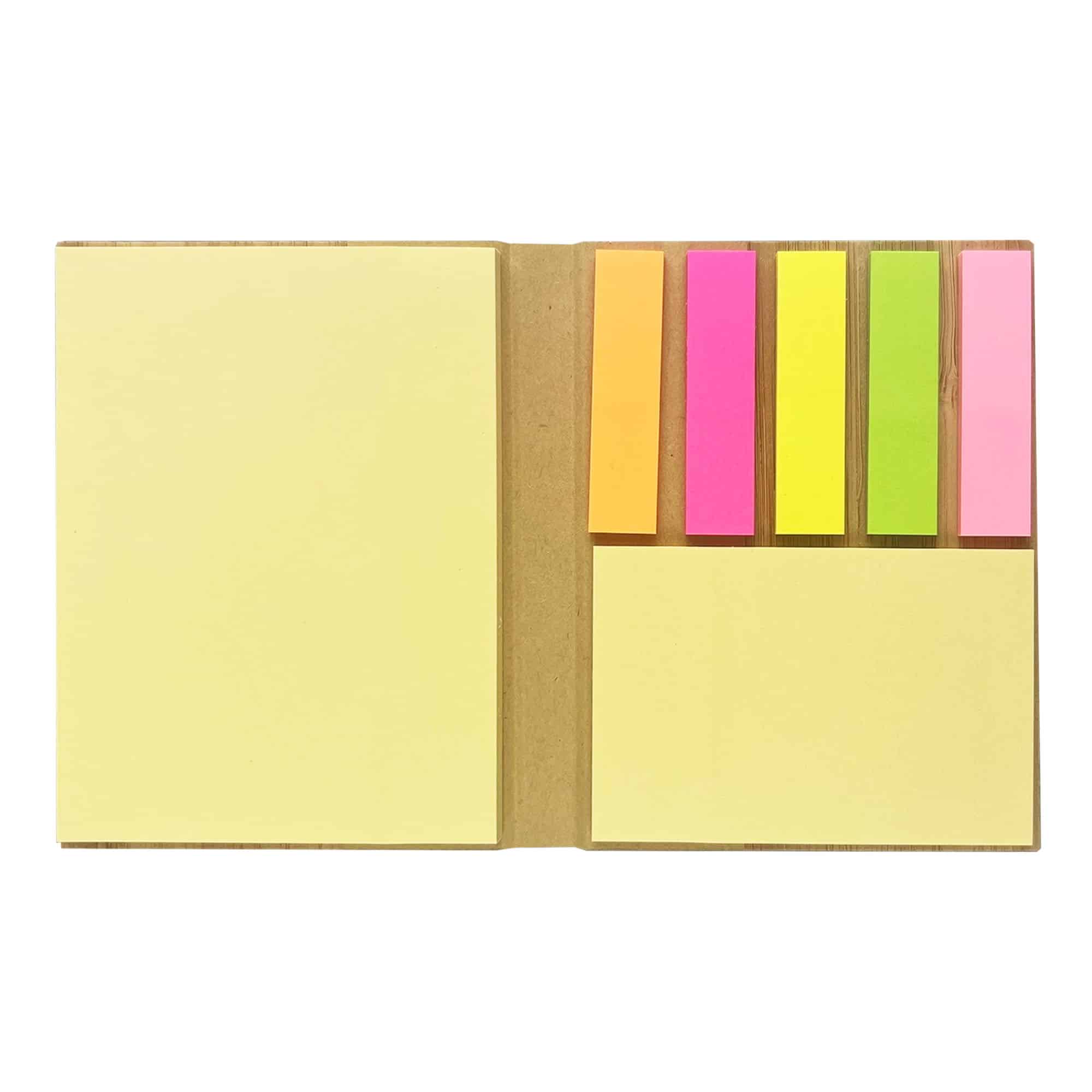 A compact note pad book with bamboo cover, it contains 2 sizes of note pad and 5 sticky flags in 5 neon colours, and self-adhesive, stick to most surfaces.