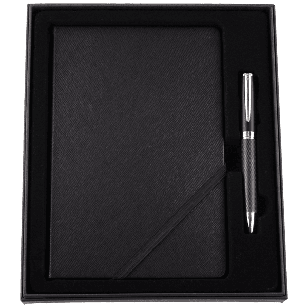 Exclusive design Scriptura imitation leather notebook gift set including a ballpoint pen and an A5 size notebook. Supplied with Black Ink